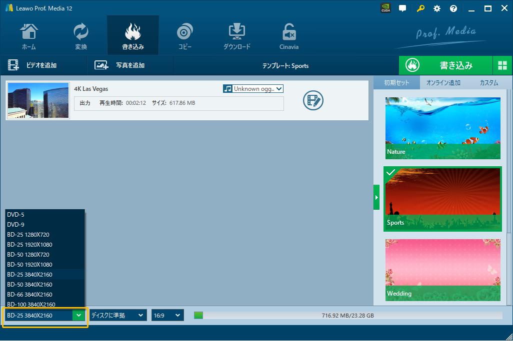ご注意:4K UHDブルーレイを焼くするには、左下にあるディスクタイプのドロップダウンボタンをクリックして、出力の4Kブルーレイディスクの種類に応じて、BD-25 3840X2160、 BD-50 3840X2160、BD-66 3840X2160、BD-100 3840X2160オプションから一つを選択してください。