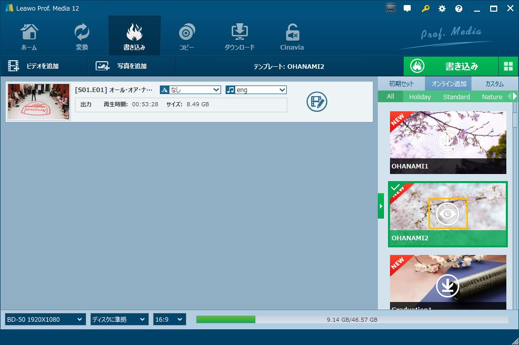 追加したメディアファイルはサムネイルまたは詳細モードで表示されます。その後、ニーズに応じて、動画ファイルを再生、動画をドラッグして順位を調整、動画ファイルの名前を変更、字幕やオーディオトラックを選択・追加、動画編集、出力メディアの種類、圧縮率、アスペクト比など、自由に設定することができます。出力に必要なディスクサイズも右下のグリーンバーに表示されています。