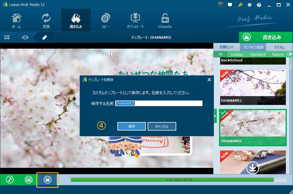 ディスクのイラストボタンをクリックすると、編集したテンプレートを保存します。保存したテンプレートは「カスタム」テンプレートに集まって、再利用が可能です。