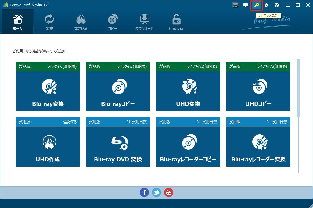 Prof. Media 13のメイン画面から、右上の「ライセンス認証」アイコン をクリックしてください。