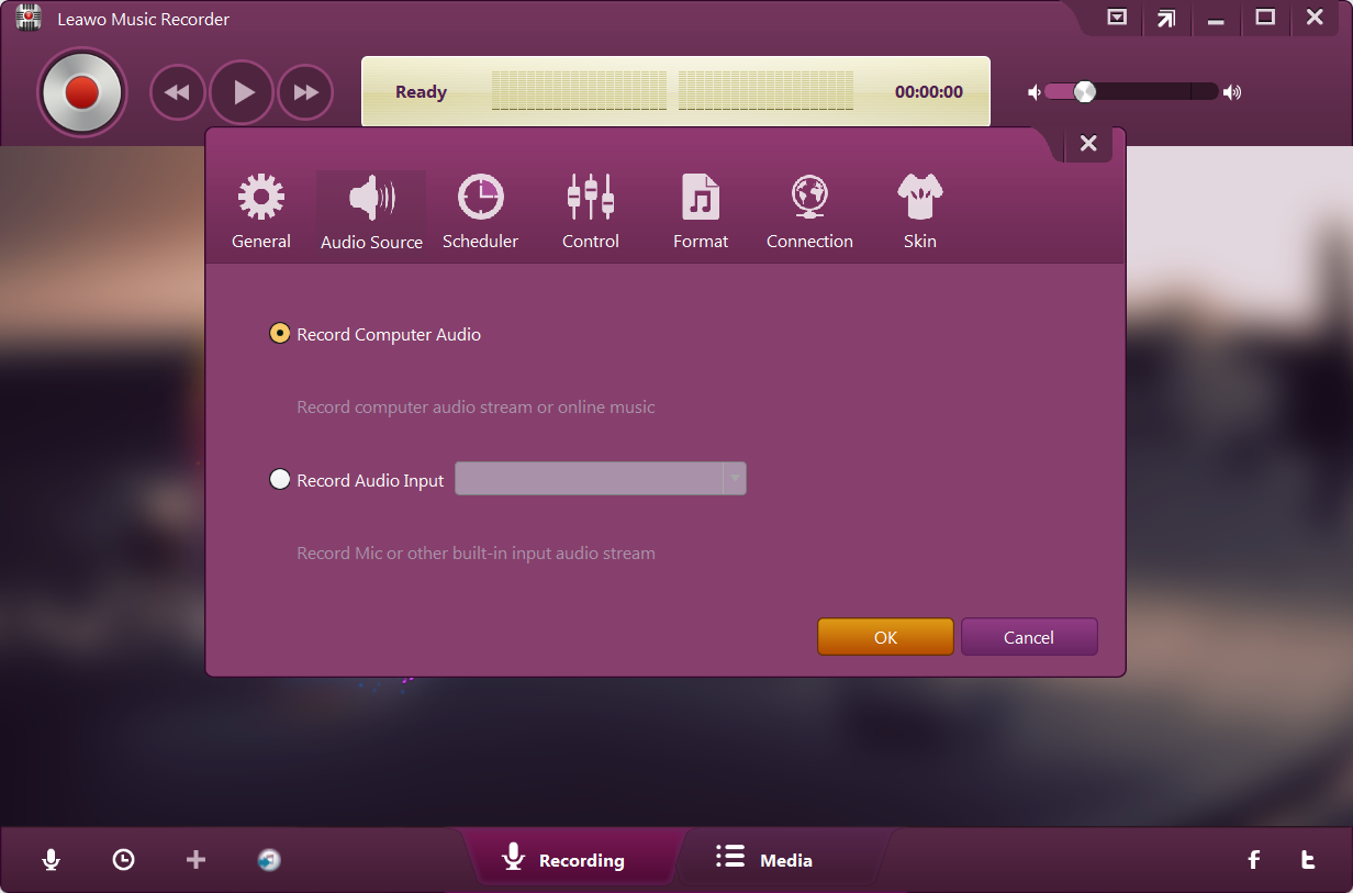 Click the "Audio Source" icon on the main interface to set audio source firstly. To record online audio and record streaming audio, select "Record Computer Audio" option. To record audio from built-in input audio like Mic, click "Record Audio Input" option.