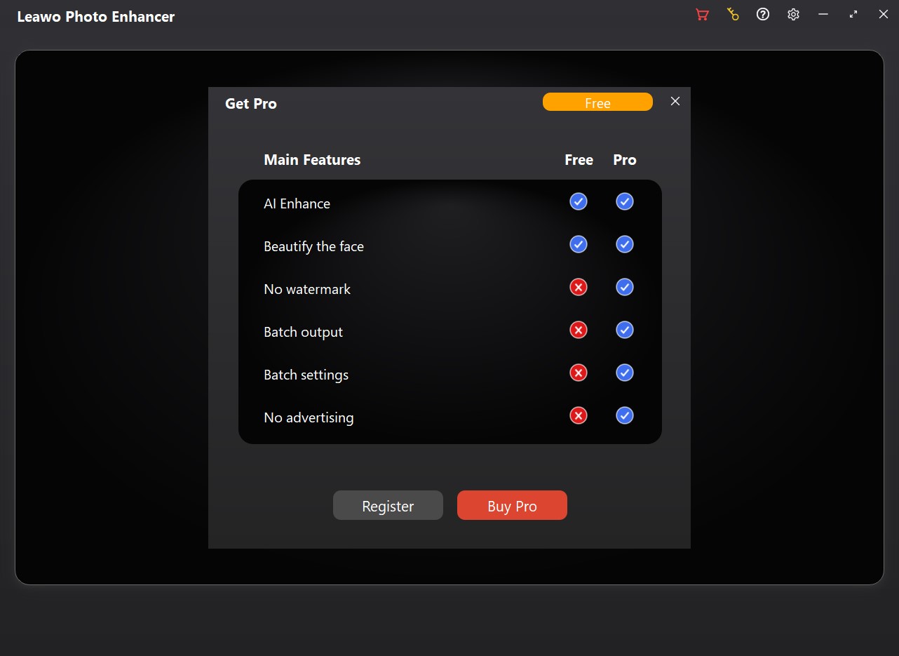 Leawo Photo Enhancer is available in both free trial and registration versions, both of which are free to download, install and experience, free of malware and spyware. However, there are some differences between free trial version, registered version, and expired version.