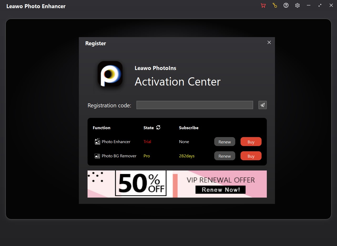 Leawo Photo Enhancer offers 2 entries for you to enter the Register interface: