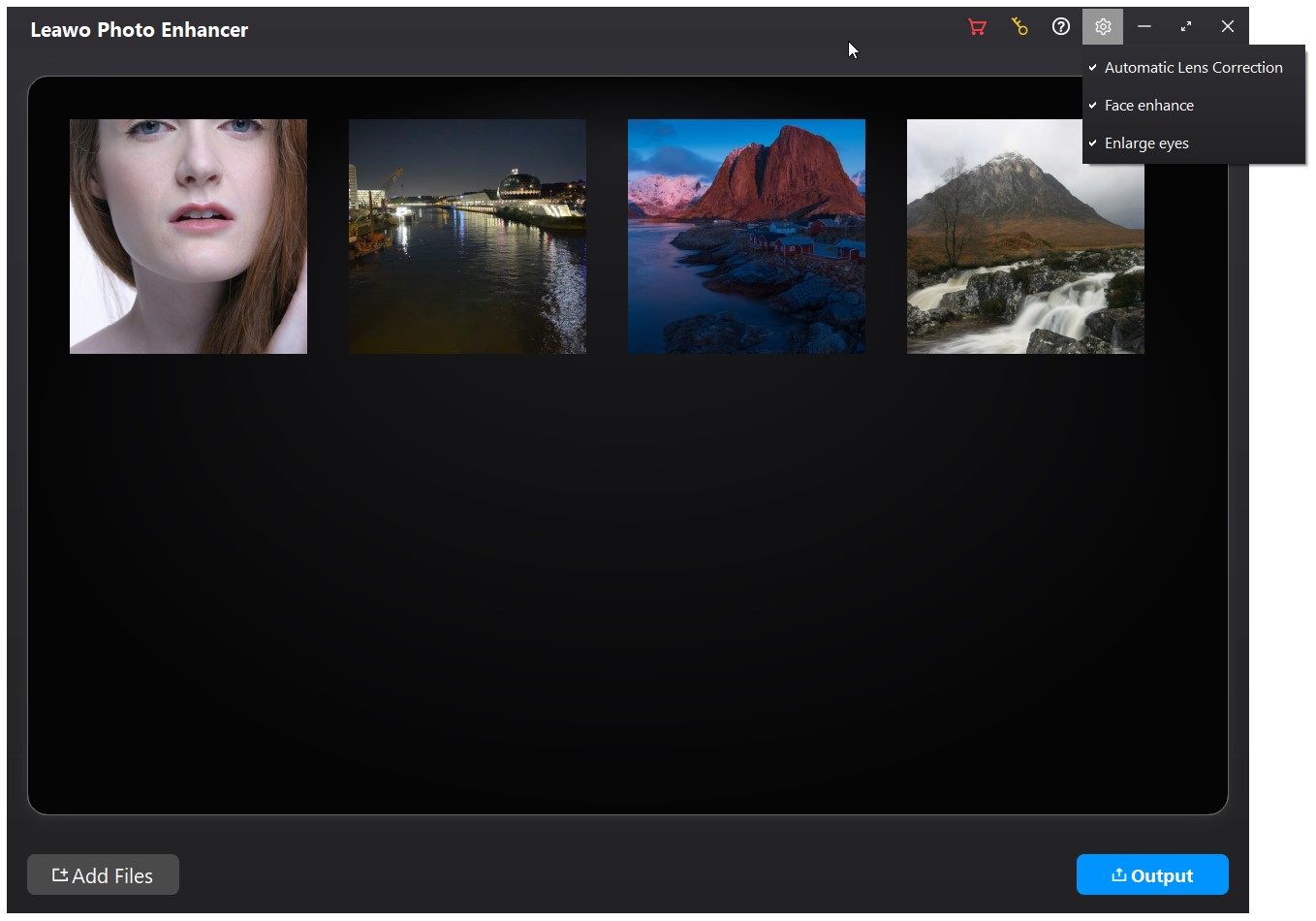 Leawo Photo Enhancer enables you to batch AI enhance photos after you load source photos. To AI enhance photos in batch, just click the "Settings" button in wheel icon on the top-right corner, and then navigate to the "Settings" option on the drop-down panel to enable "Automatic Lens Correction", "Face enhance" and/or "Enlarge eyes" features. Leawo Photo Enhancer will then automatically enhance photos in batch according to the features you have enabled for output. You then only need to click the bottom right "Output" button for output settings.