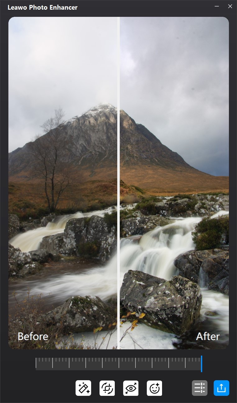 There is an effect adjuster bar right below the previewer, which enables you to adjust the photo AI enhancing degrees. By driving the slider to the right, the AI photo enhancing effect will be much more obvious. By putting the slider to the right end, you get maximize AI photo enhancement. You could apply the adjustment to single photo easily.