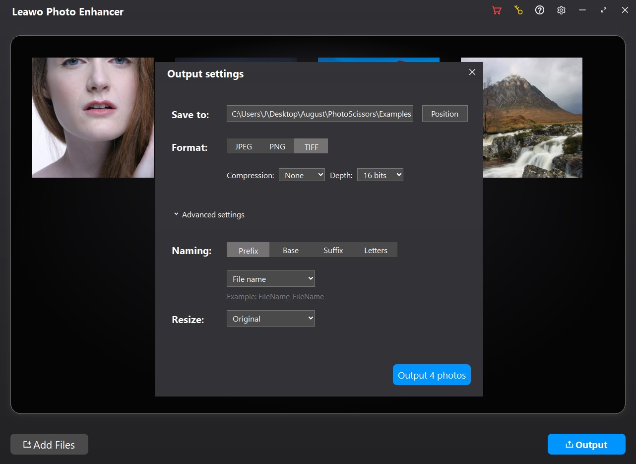 Then, finally, on the "Output settings" window, click the blue "Output <number> photos" button to output AI enhanced photos. If the target folder has pictures with the same name, Leawo Photo Enhancer will notice you.