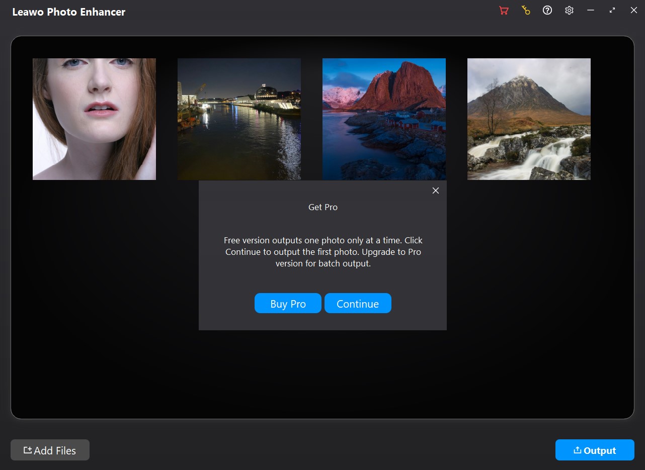 If you are using free trial version, you will get a "Get Pro" notice window that shows you the limitation of free trial version and offers you options to "Buy Pro" and "Continue". You could click "Buy Pro" option to purchase Pro version and register Leawo Photo Enhancer to experience its full features, or click "Continue" button to experience the free trial version.