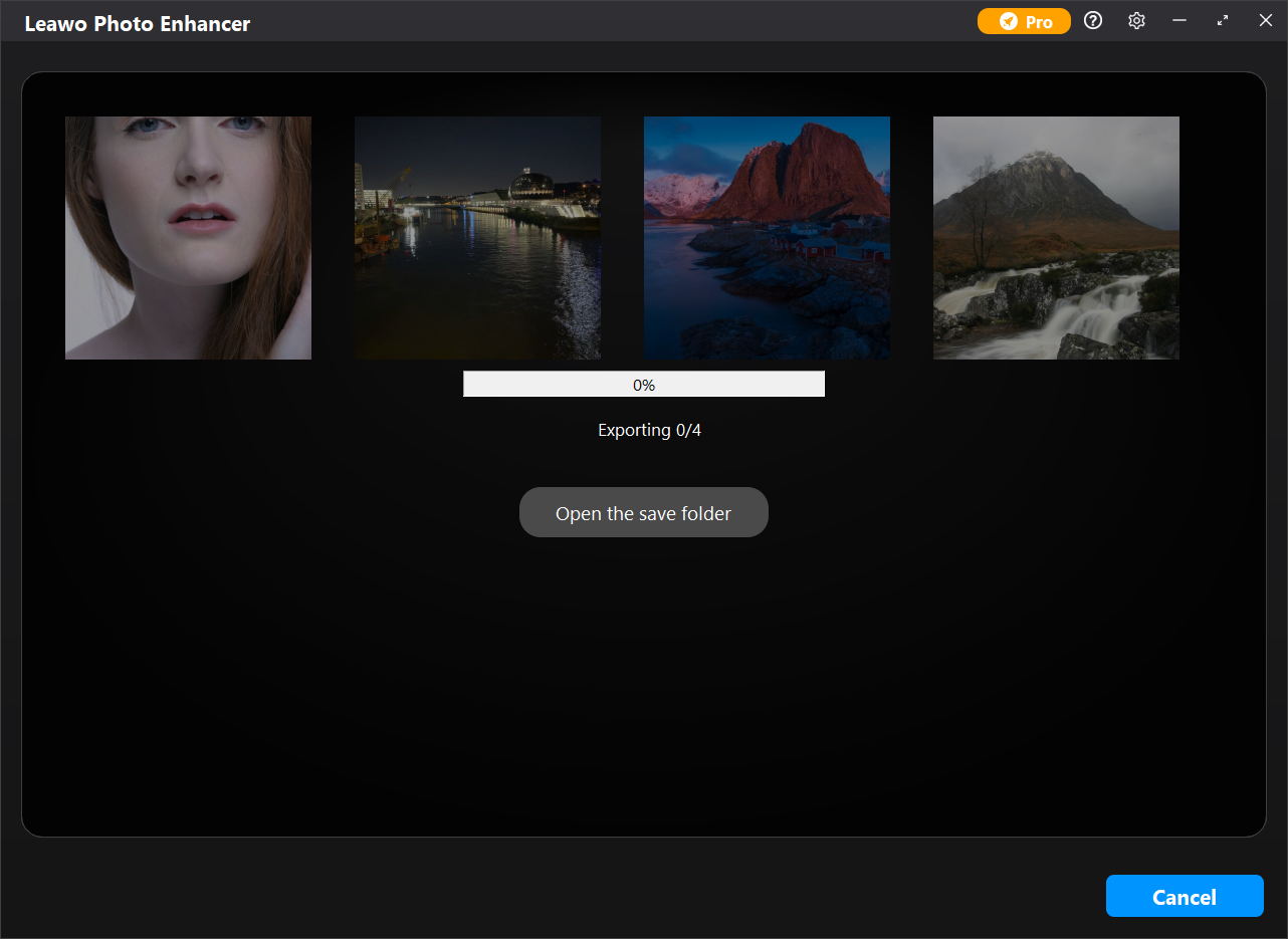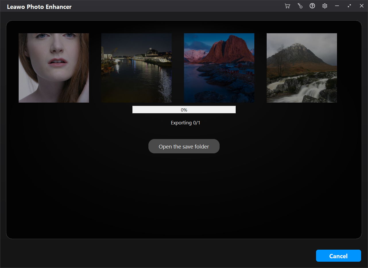You could click the "Cancel" button anytime you like during the exporting process. When the exporting completes, you could click the "Open the save folder" button to open the folder that saves all AI enhanced photos exported.