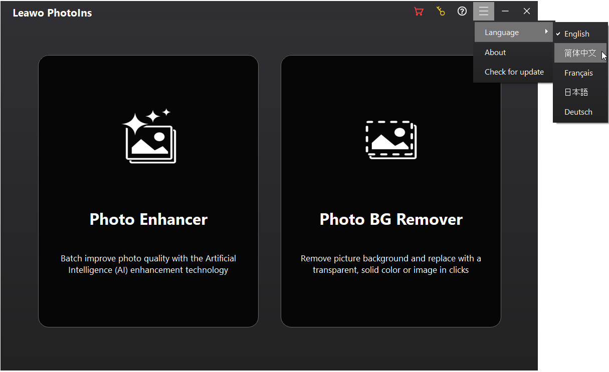 Once you have launched Leawo PhotoIns on your computer, click the three-bar icon on the top-right corner, and then navigate to the "Language" option. The multiple UI language panel will pop up with several language options: Simplified Chinese(简体中文), English, French (Français), Japanese(日本語)and German (Deutsch). Simply select a language you prefer to as program UI language for Leawo PhotoIns.