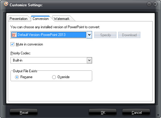 Open the Conversion tab to set conversion customization settings, including: choose installed version of PowerPoint to convert, Mute in conversion, Priority Codec, and what to do if output file already exists.
