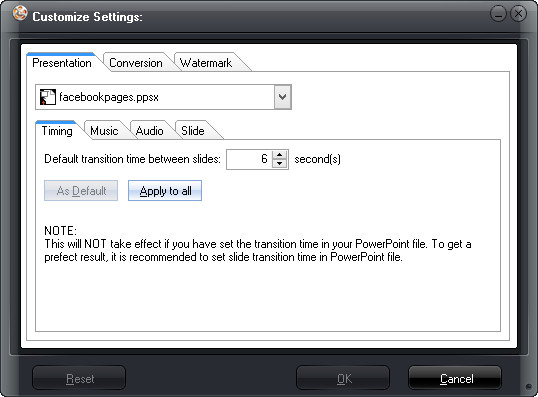 Once you open the Customize Settings panel, you will firstly see the Presentation tab, on which you firstly select a loaded PowerPoint presentation file and then determine its Timing, Music, Audio and Slide.