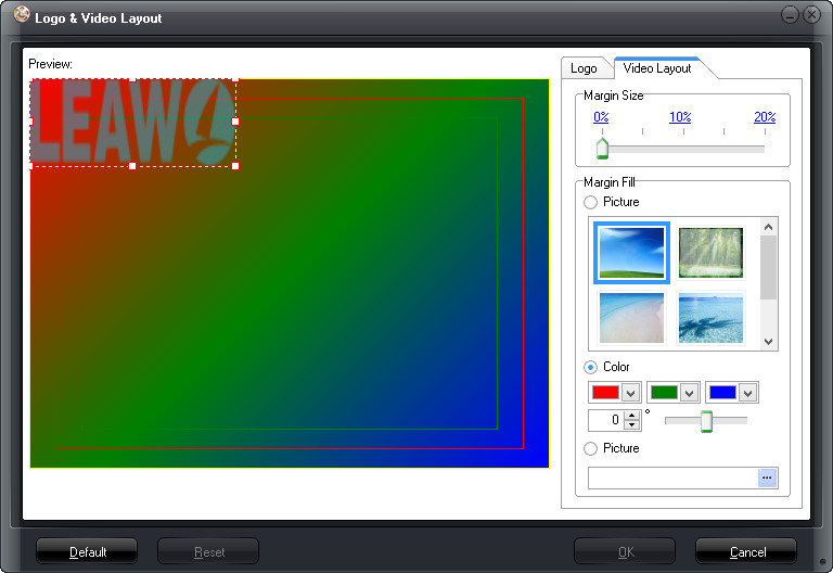 Open the Video Layout tab to set output video layout. You could determine the Margin Size, and Margin Fill (including preset picture, color or picture from local drive).
