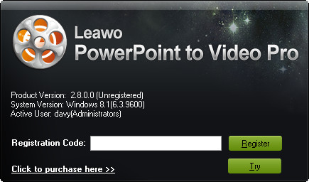 If you haven't got a license code of Leawo PowerPoint to Video Pro, you need firstly purchase a license and then register it. To purchase Leawo PowerPoint to Video Pro license, you could directly visit Leawo PowerPoint to Video Pro purchase page, or click the Purchase button