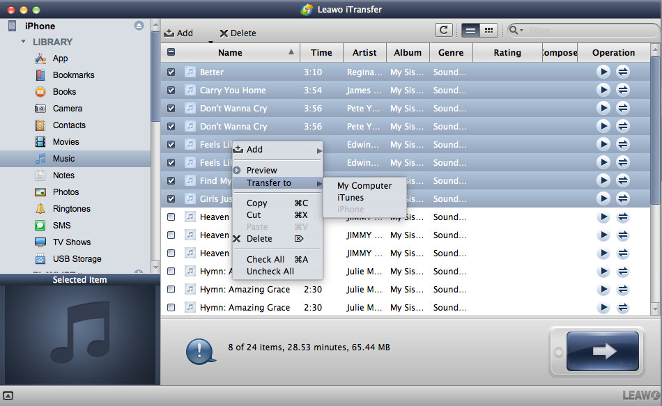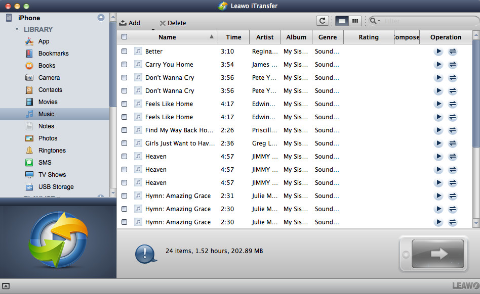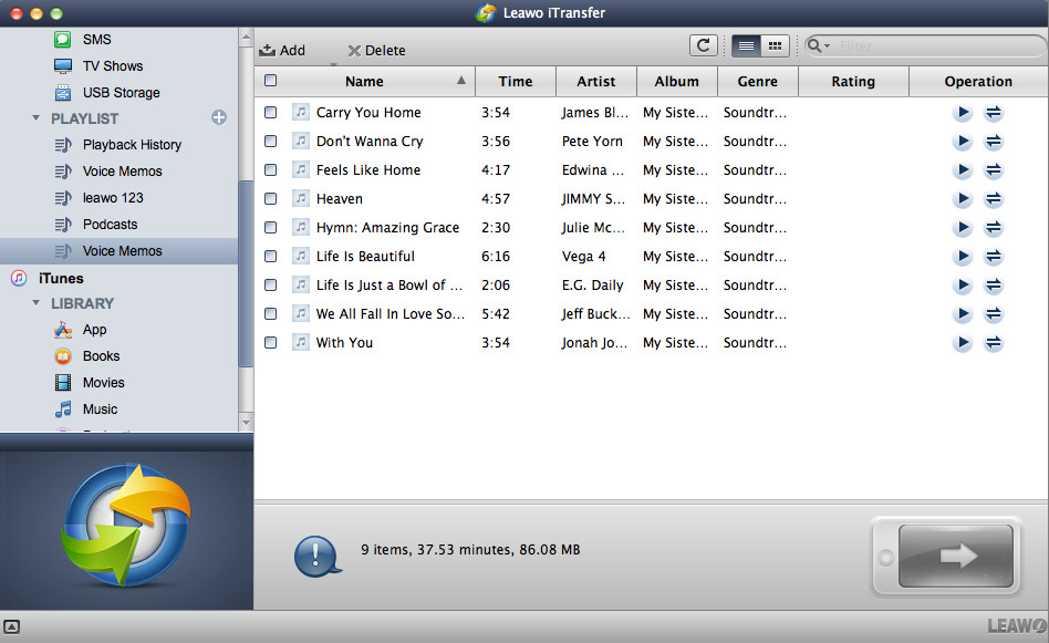 Leawo iTransfer para Mac é um excelente gerenciador de iPod/iPad/iPhone que torna muito fácil para você gerenciar todos os tipos de arquivos. Listas de reprodução, contatos, SMS, notas e muito mais podem ser gerenciados de forma eficaz.