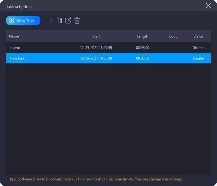After setting, click the "OK" button to save the new task and exit. In the main interface of "Task schedule", all tasks will be listed with start time, record length, loop and status. Then, you can manage the tasks through four buttons in the top menu bar.