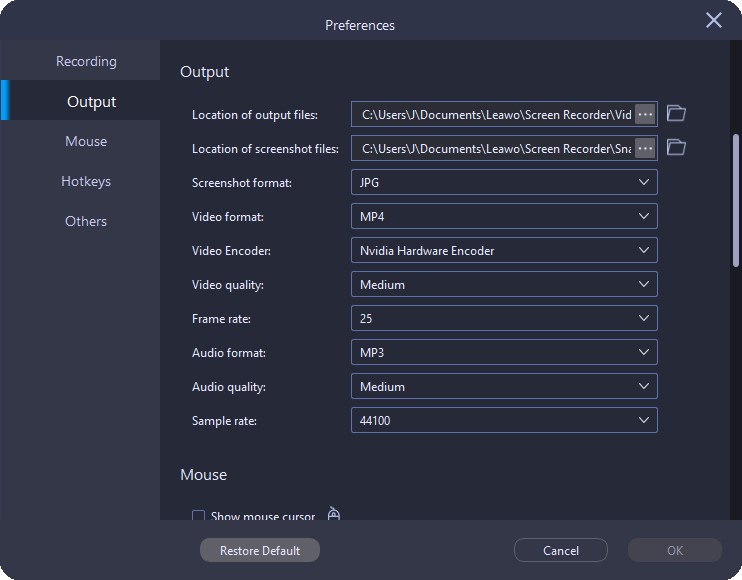 Before recording screen, you can first set the output directory, video format, video encoder, video quality, video frame rate, audio quality, and audio sample rate. Click the three-bar icon on the top menu bar and choose "Settings" option in the drop-down menu, a "Preferences" panel will pop up. Click "Output" tab in the left column to set output preferences.