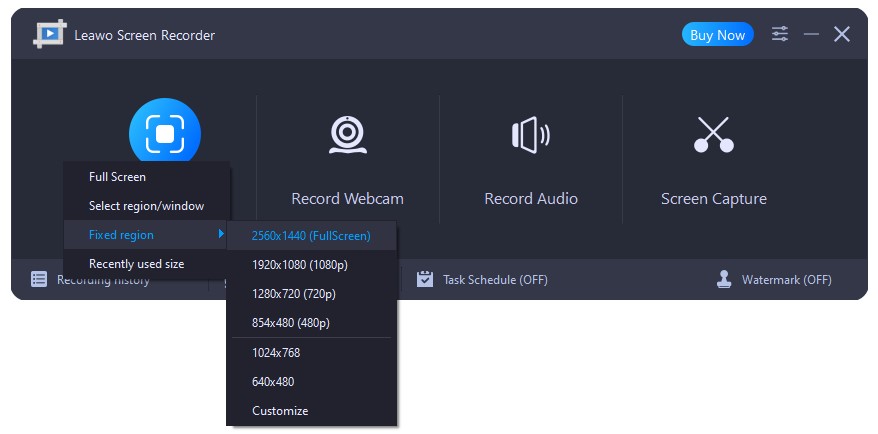 Once you click the "Record Screen" button on the main interface, a drop-down menu will pop up, where you can select recording region among Full Screen, Select region/window, Fixed region, or Recently used size.