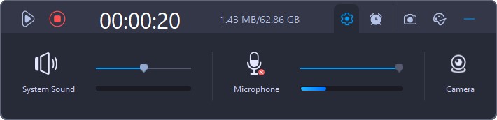 If you want to enable or disable "System Sound", "Microphone" or "Camera" during the screen recording process, click the settings button , and then click the icon of each feature to enable or disable the corresponding feature.