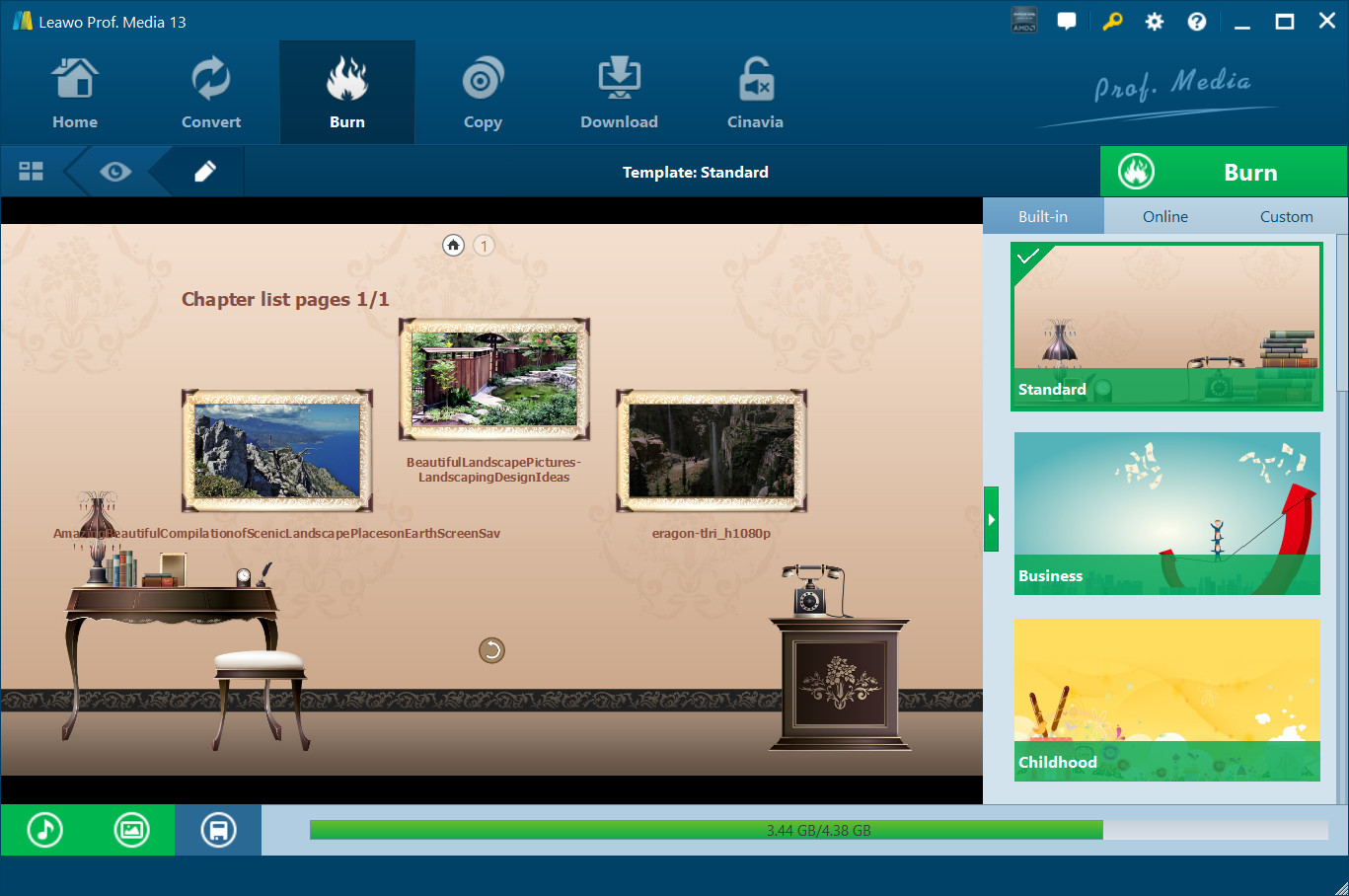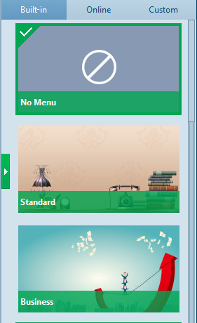 Under the Built-in menu tab, you could select any disc menu theme for output. Or, if you want more, you could open the Online tab and then download more disc menu templates from Leawo's disc menu online database. The Custom tab would collect all disc menu templates you've customized with the internal disc menu designer.