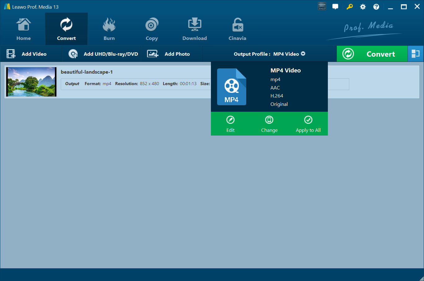 The generated photo slideshow could be converted into 180+ formats for multiple uses. Click the drop-down box next to the " Add Photo " button and then you could see a drop-down panel that lists 3 options: Edit, Change and Apply to All .