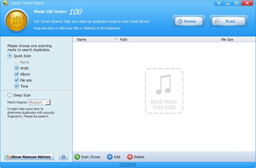 Leawo Tunes Cleaner provides the most cost-effective solution to help clean up iTunes and other music libraries in clicks. By cleaning up, it makes your music files tidy and well organized in your iTunes or other music folders. Being a professional iTunes cleanup program, this iTunes cleanup software could act as an iTunes duplicate remover to detect and delete duplicate songs in iTunes or music folders. It gets 2 different scanning modes to meet your needs more. Besides, it features a music tag editor that could let you add or edit music tags manually, including artist, album, album cover, song name, etc. as well. It could even save unfixed music files for future fixing. The user-friendly program interface provides specified entries for you to do corresponding options.