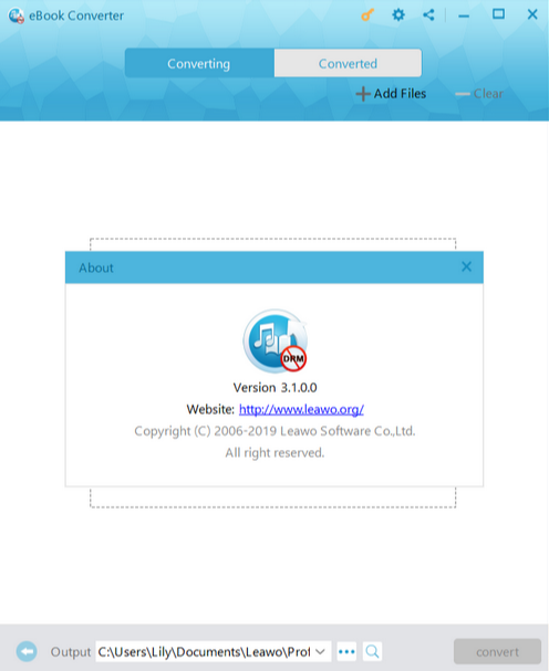 Under “About” button, you can check the version number of Leawo Prof. DRM together with other information.