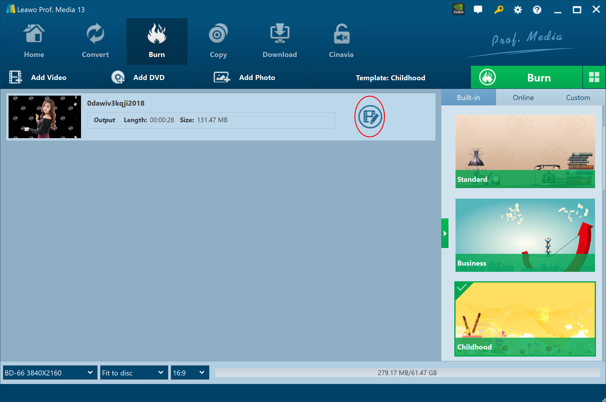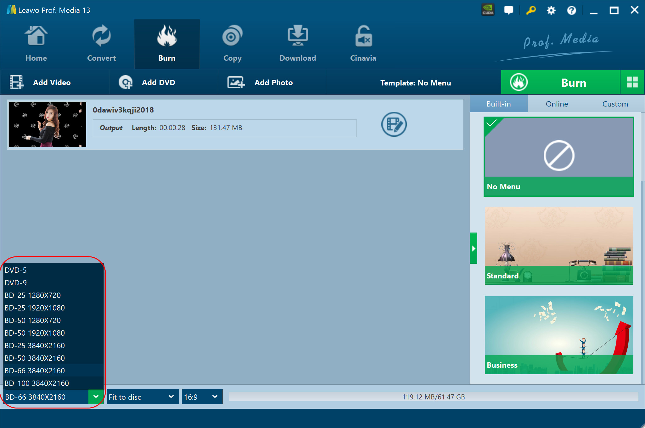 Similar to burning videos to 4K Blu-ray, it’s also possible and optional for adding disc menu in photo to 4K Blu-ray burning. The operation is exactly the same as that of adding disc menu for video to 4K Blu-ray burning. Please refer to that part for detailed operation.