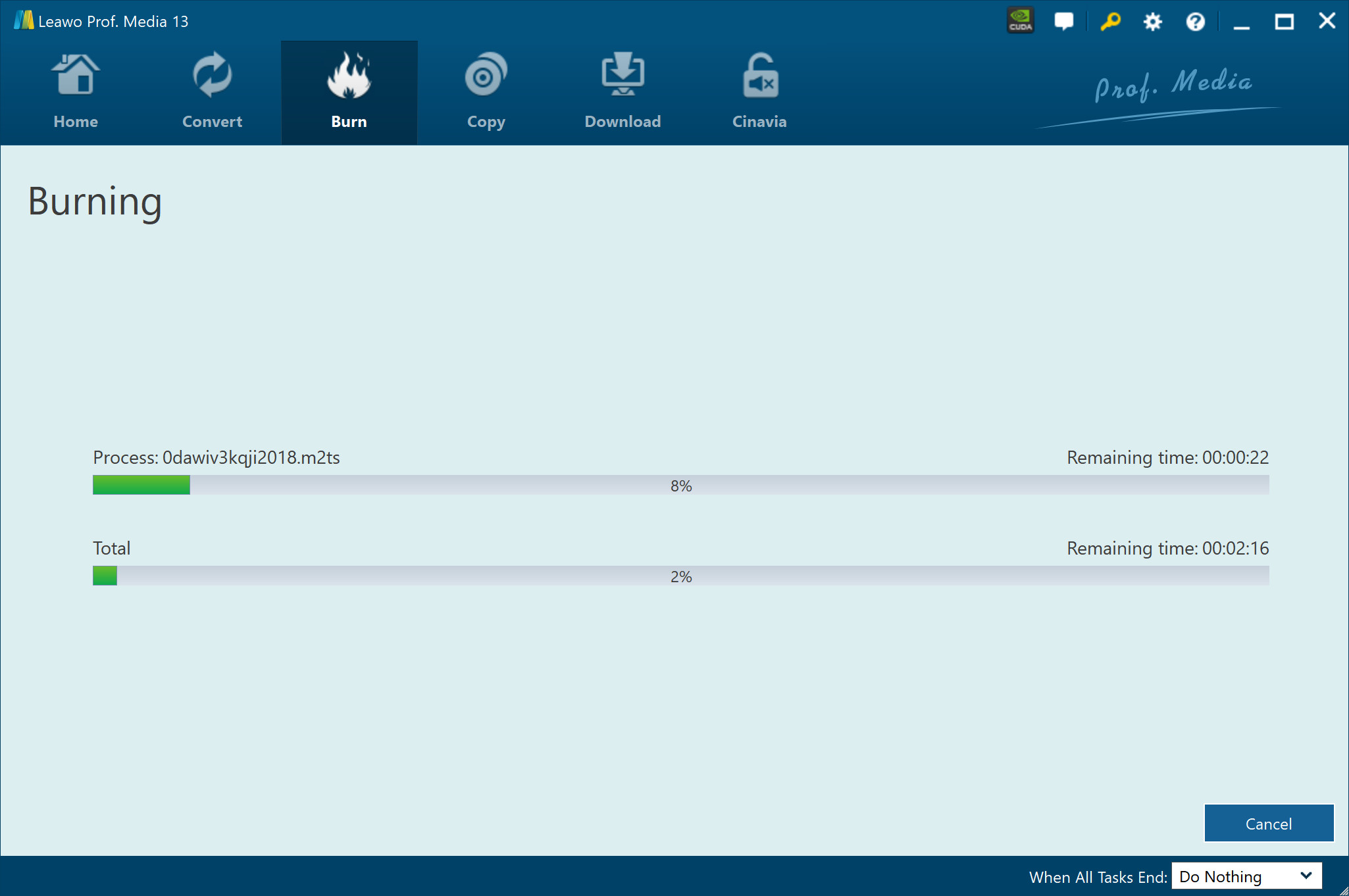 Finally, click the "Burn" button at the bottom of the sidebar to start burning photos to 4K Blu-ray within Leawo UHD Creator. On the "Burning" interface, you could view the entire burning process and set after-done operation at the bottom right corner.