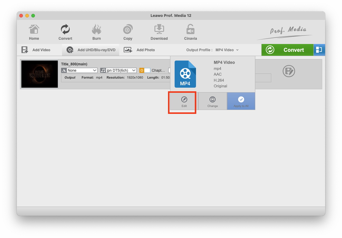Click "Add Video" button to import source video files, or click "Add UHD/Blu-ray/DVD" to import DVD disc, folder, or ISO image file. Alternatively, you can directly drag and drop the source file into the converting panel.
