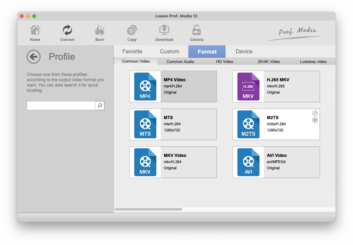 You can choose either video/audio format or mobile device as output profile under "Format" or "Device" group. You can also make good use of the quick searching box on the left to fast locate your desired profile.