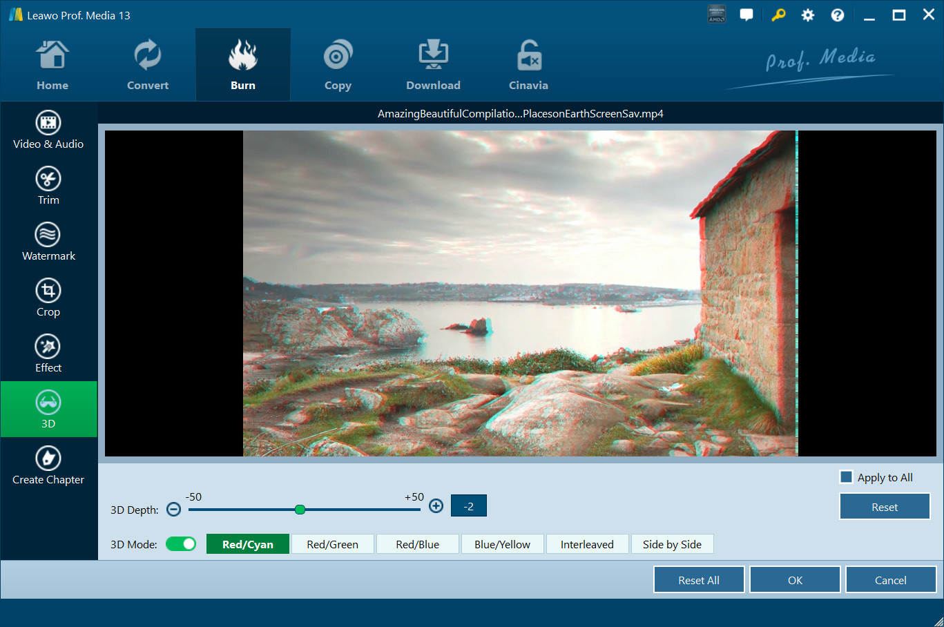 On the video editing panel, open the "3D" tab and then slide the "3D Mode" to green. You could then choose a 3D effect to apply to the final video file. There are in total 6 different 3D movie effects available for you to choose from: Red/Cyan, Red/Green, Red/Blue, Blue/Yellow, Interleaved, and Side by Side. Select one according to the 3D glasses you are using to enjoy 3D videos. For more vivid 3D effect, you could even directly drag the slide or set values in 3D Depth to adjust 3D depth. Tick "Apply to all" to apply selected 3D movie effect to all video files.
