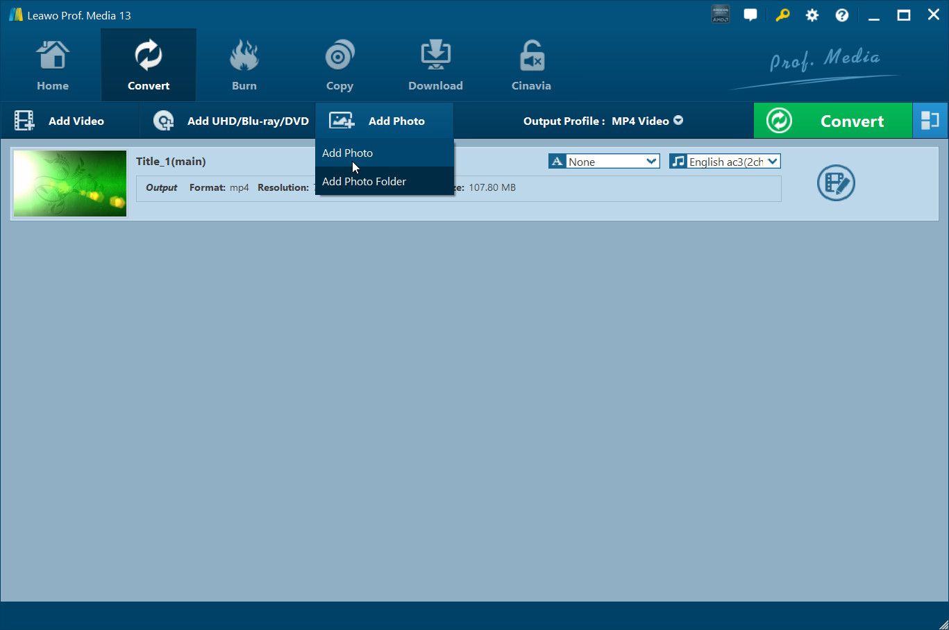 Click the "Convert" module and then click the "Add Photo" button to browse and add photos you want to turn into slideshow into this photo slideshow maker. Selected photos would be automatically generated into a photo slideshow upon loading. You could click the thumbnail icon to play back generated photo slideshow.