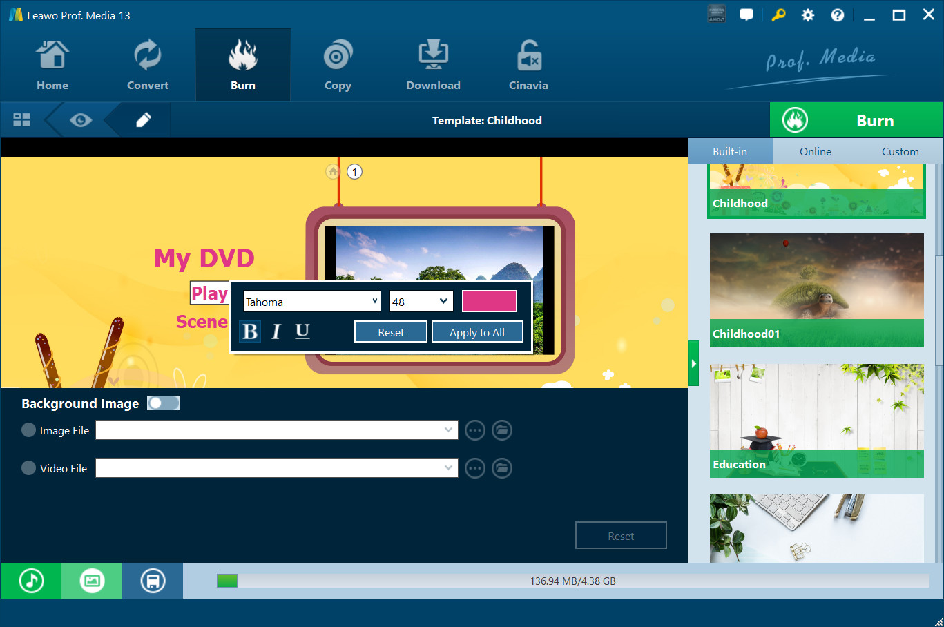 You could design disc menu by clicking the pencil icon on the preview panel. You could add personal image, video and music as background, reposition titles, change title content, adjust text color, size, font, etc. After designing, click the "Save" button to save designed menu into Custom group.