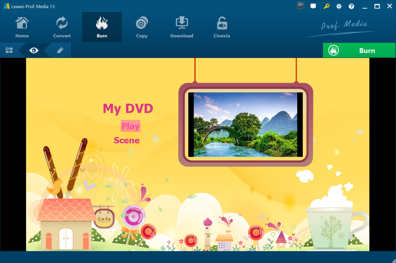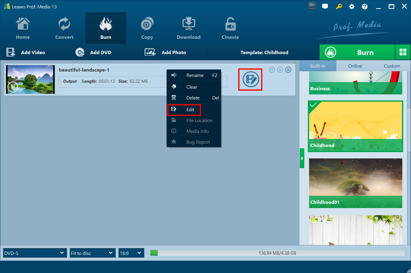 Select a disc menu template from the right sidebar and preview it by clicking the middle of selected disc menu.