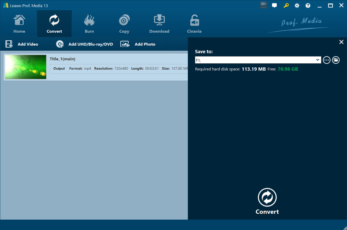 Click on the big green "Convert" button on main interface to pop up a sidebar. On the popup sidebar, set a directory to save the output photo slideshow files in the "Save to" box.