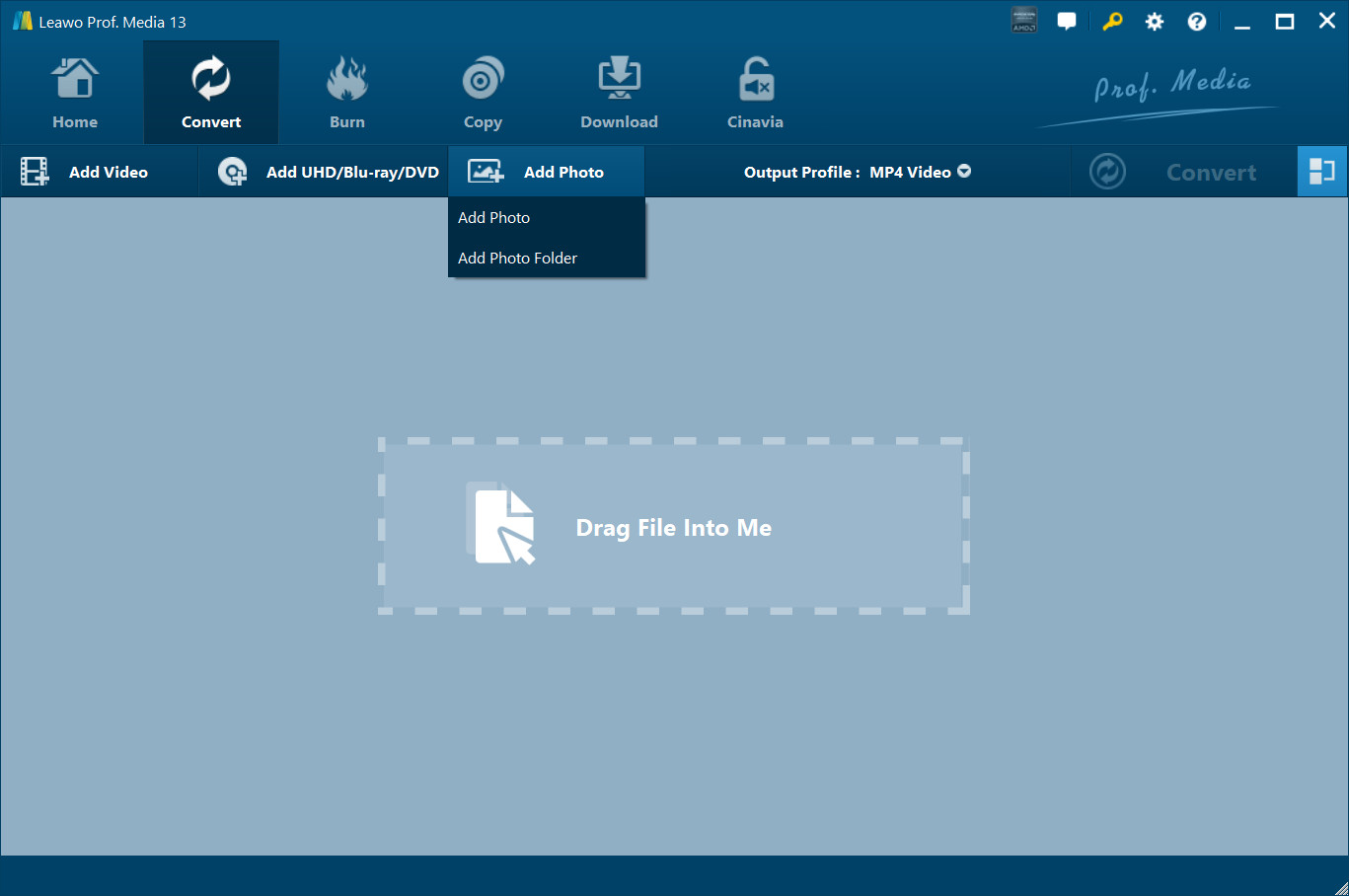 On the main interface of Leawo Video Converter, click on the "Add Photo" button on the menu bar of the software, or directly drag and drop photos into the photo slideshow maker software. You could add either photo files or photo folder as you like. Photos would be automatically generated into photo slideshow upon loading. You could play back generated photos if you like.