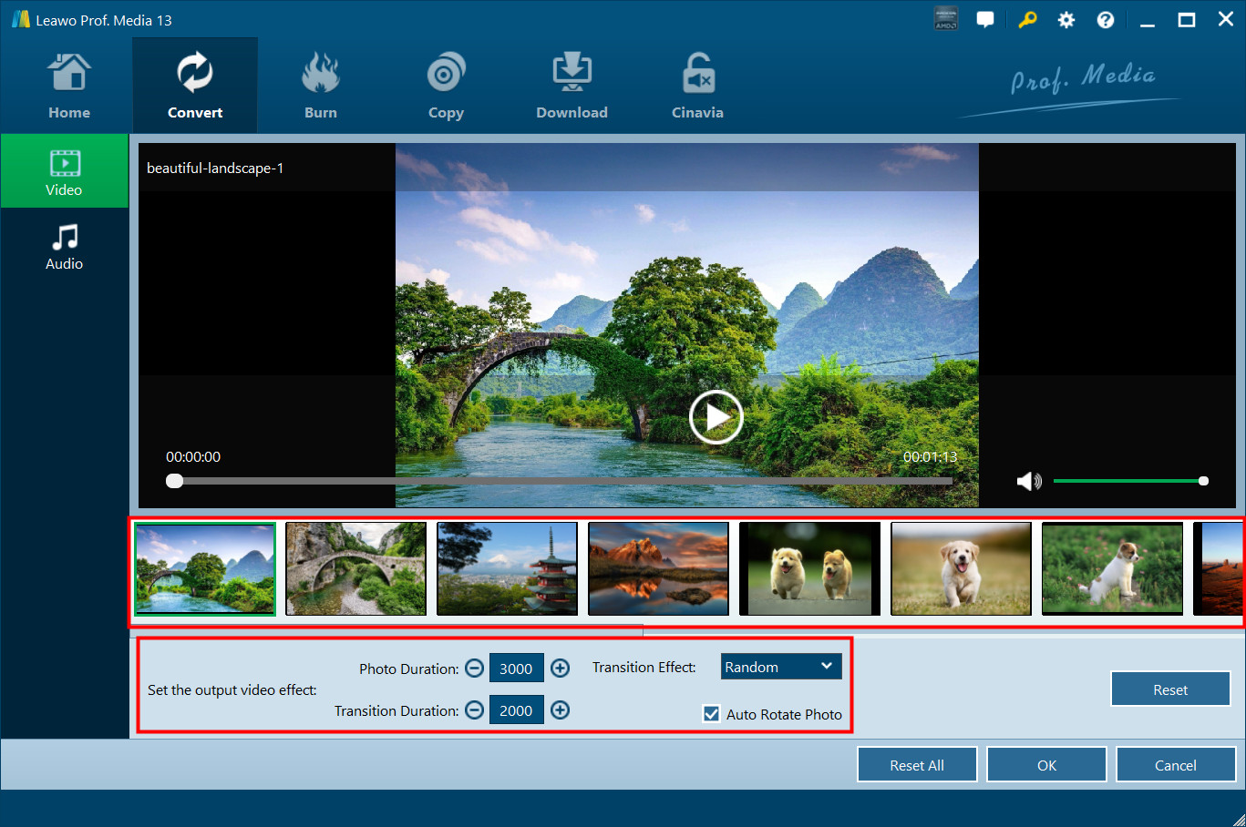 Under the “Video” tab, you could add external photos, remove photos, adjust photo order, set photo duration, transition duration and transition effect.
