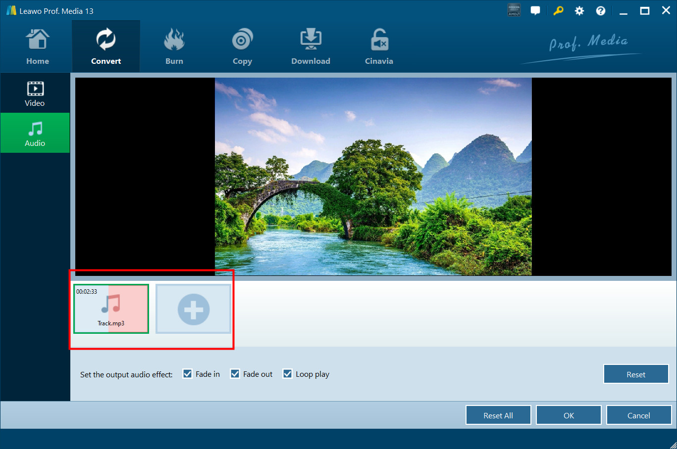 After music files are imported, you are allowed to set the output audio effect like Fade in, Fade out, and Loop play. Click “OK” button to confirm setting and return to the main interface.