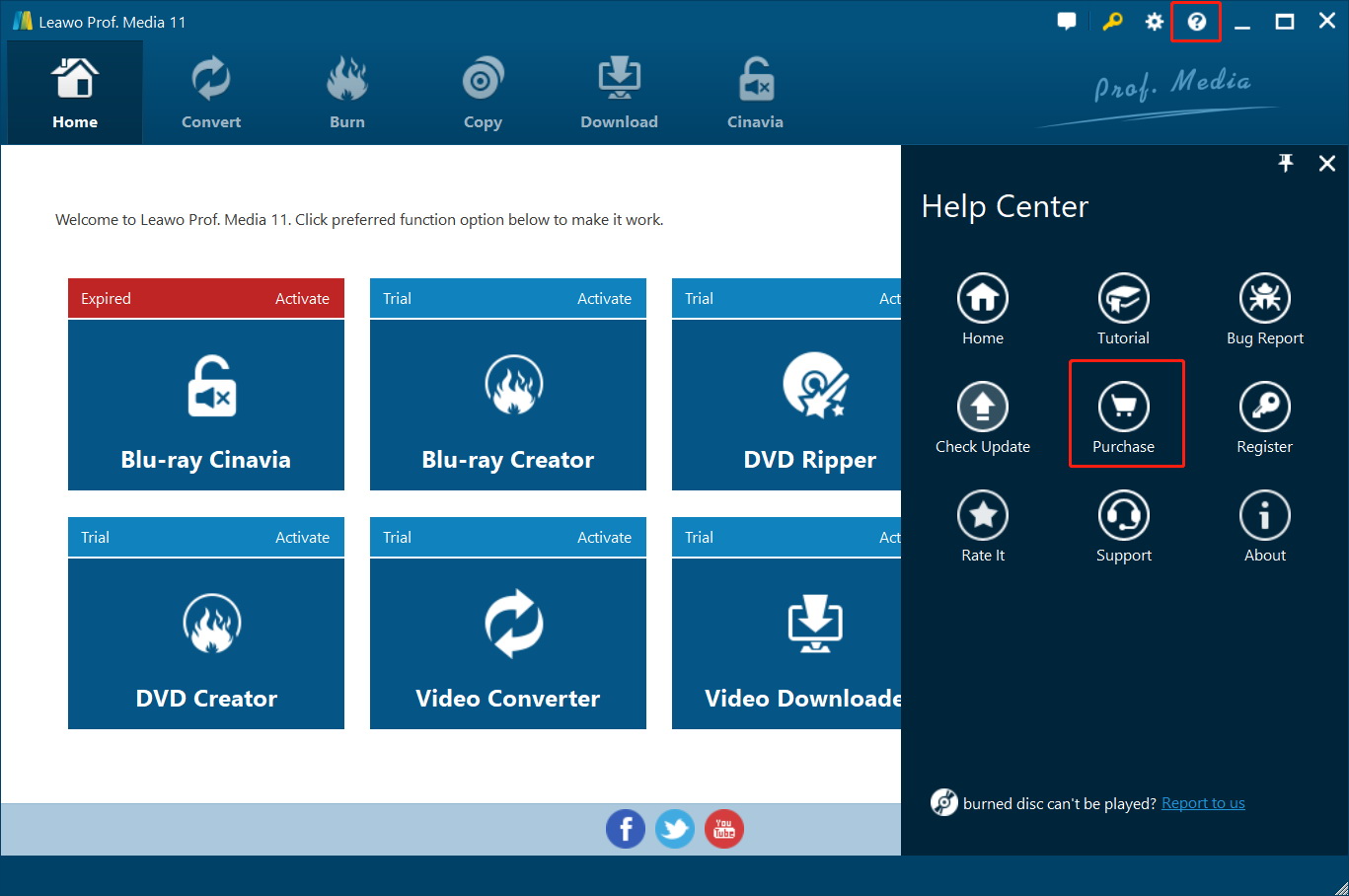 b. The second way is to click the Help button to enter the Help Center, and then click Register if you have the code, Or click Purchase to get it.