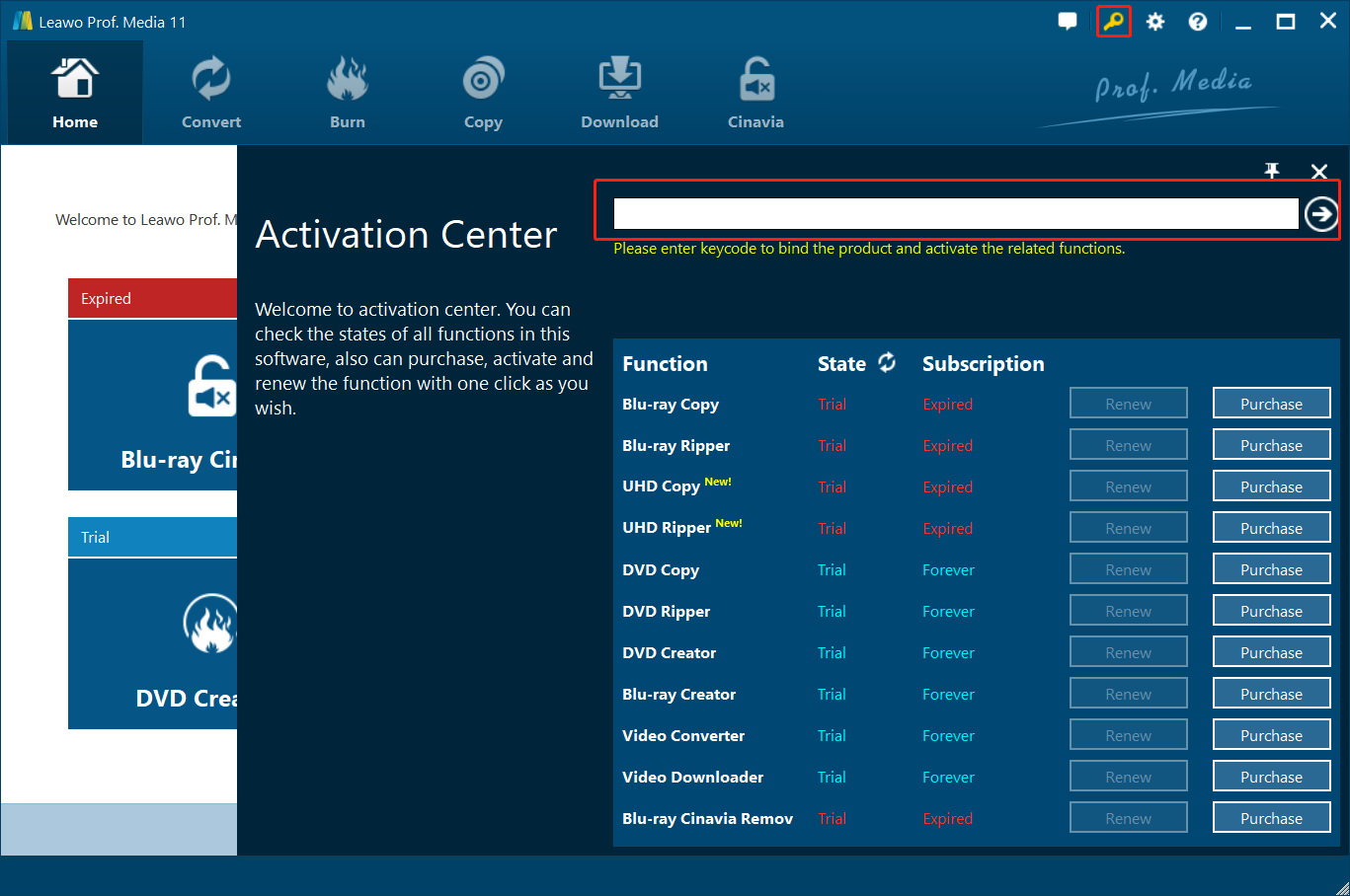 a. If you already have the registration code, just click the Register button to open the Activation Center and input your code on the code box. If you don't have the code, click the Purchase button of Video Downloader on the module list below and it'll take you to the purchase page.