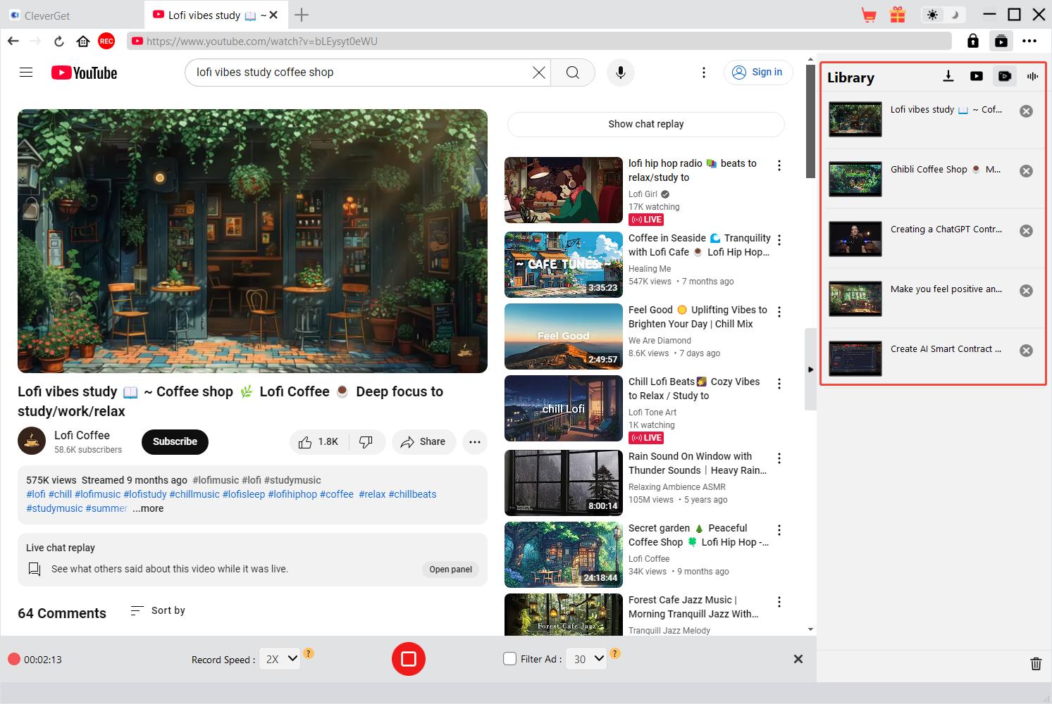 You could stop recording and then continue recording any time you like. CleverGet Streaming Video Recorder will generate a recording file every time you stop the recording. You could view the recordings on the right sidebar, which could be opened/hidden by clicking the "Library" icon