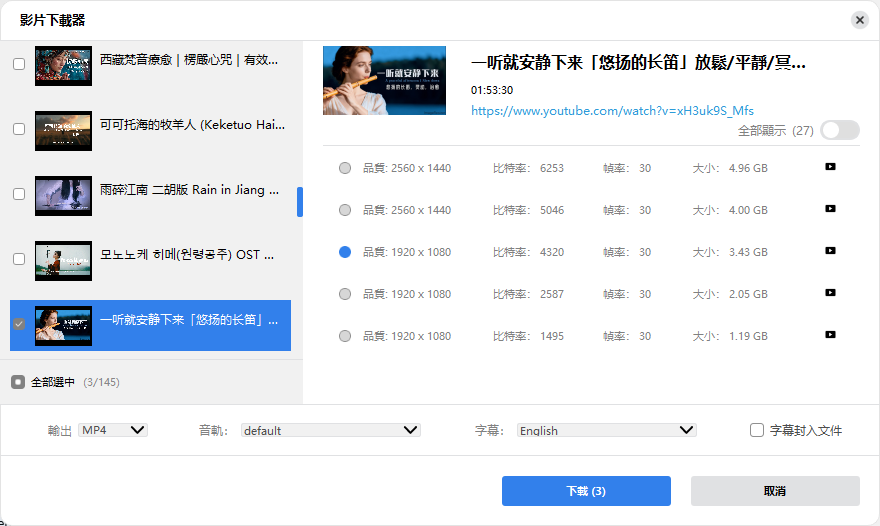 軟體完成鏈接解析後,會彈出視頻資源列表,顯示該視頻支援的畫質選項(如 1080P/4K/8K)、音視頻格式(如 MP4/FLV/MKV)以及單獨音頻下載選項。根據你的需求勾選對應的資源規格,可複選多個畫質 / 格式同時下載。