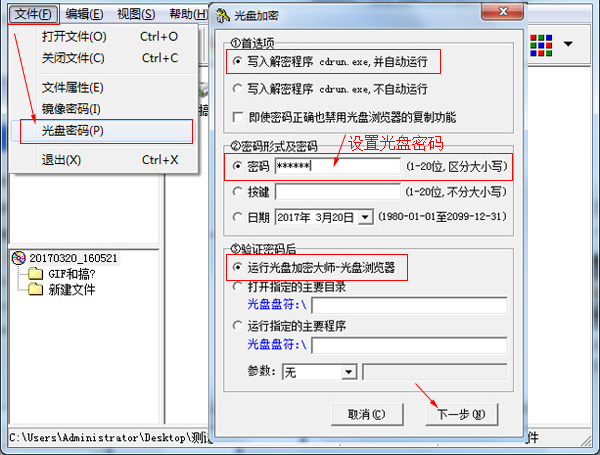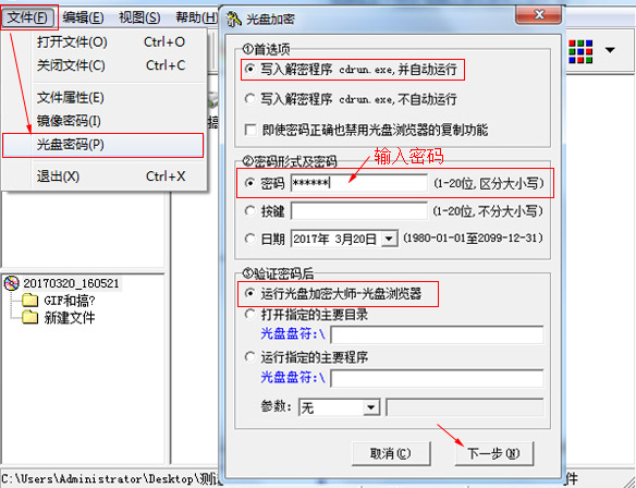 再从菜单栏上点击“文件”–“光盘密码”在弹出的光盘加密设置界面中,①首选项选择“写入解密程序 cdrun.exe,并自动运行”,②密码形式及密码选择“密码”并给光盘设置密码,也可以选择按键或日期形式作为密码,③验证密码后选择“运行光盘加密…….”。并点击“下一步”。