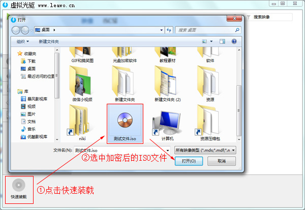 打开虚拟光驱软件,在软件主程序界面中底部,点击“快速装载”这个圆圈按钮,弹出了打开的窗口,从电脑中选择已经加密后的ISO镜像文件后点“打开”。运行桌面上的计算机
