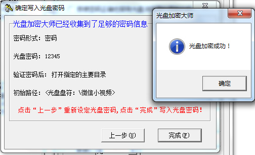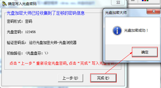 上一步之后,来到这一步在确定写入光盘密码窗口上,会显示密码形式,光盘密码,还有验证密码后等设置的信息,点击“完成”后就会弹出“光盘加密成功!”的提示框了。