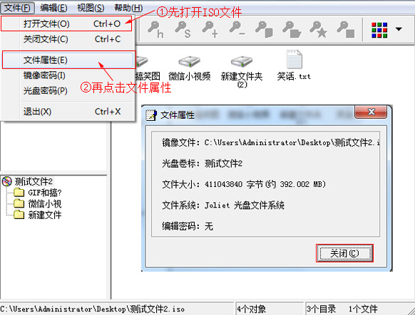 同样的打开光盘加密软件后,先点“文件”–“打开文件”将制作好的ISO镜像文件打开,再点“文件”–“文件属性”可以查看镜像文件的属性信息。第二种方法,小编用的是测试文件2来作为测试的镜像文件。