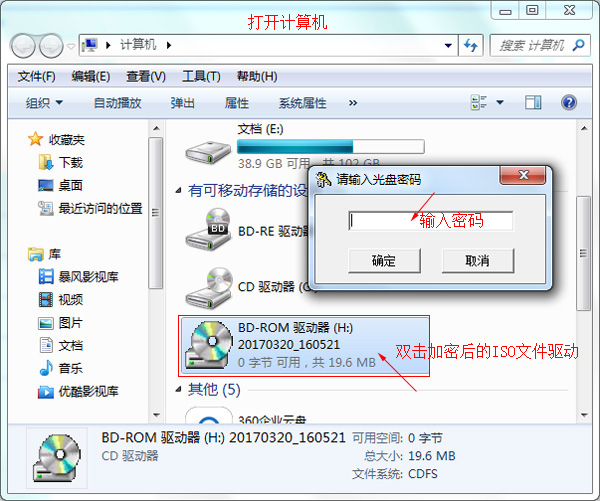 ,在有可移动存储的设备里就会显示该测试文件的光盘,双击它就会弹出请输入光盘密码的小窗口,要输入密码之后才能够访问这个光盘,并查看里面的信息。