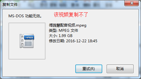 你就会发现,没有自定义大小或变为超大文件的视频是可以直接复制的,而已经自定义大小或变为超大文件这种文件可以直接运行,但是无法直接复制,复制之后就会提示下图中的情况,显示“MS-DOS功能无效”。在下图的提示框中,你能看到该视频的大小竟然是1.99G,这就是自定义大小或变为超大文件后的大小。