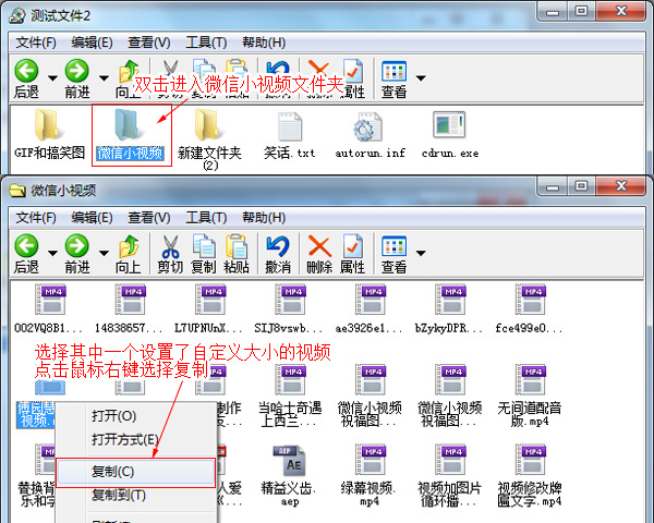 进入到光盘的内部情况,双击进入微信小视频这个文件夹,因为里面的有些视频已经“自定文件大小或变为超大文件”了,点击视频右键单击,并选择复制。在电脑桌面上进行粘贴。