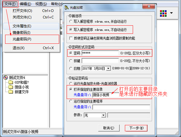 接下来就可以给光盘加上密码了,从菜单栏上点击“文件”–“光盘密码”在弹出的光盘加密设置界面中,①首选项选择“写入解密程序 cdrun.exe,不自动运行”,②密码形式及密码选择“密码”并给光盘设置密码,也可以选择按键或日期形式作为密码,③验证密码后选择“打开指定的主要目录”。并点击“下一步”。